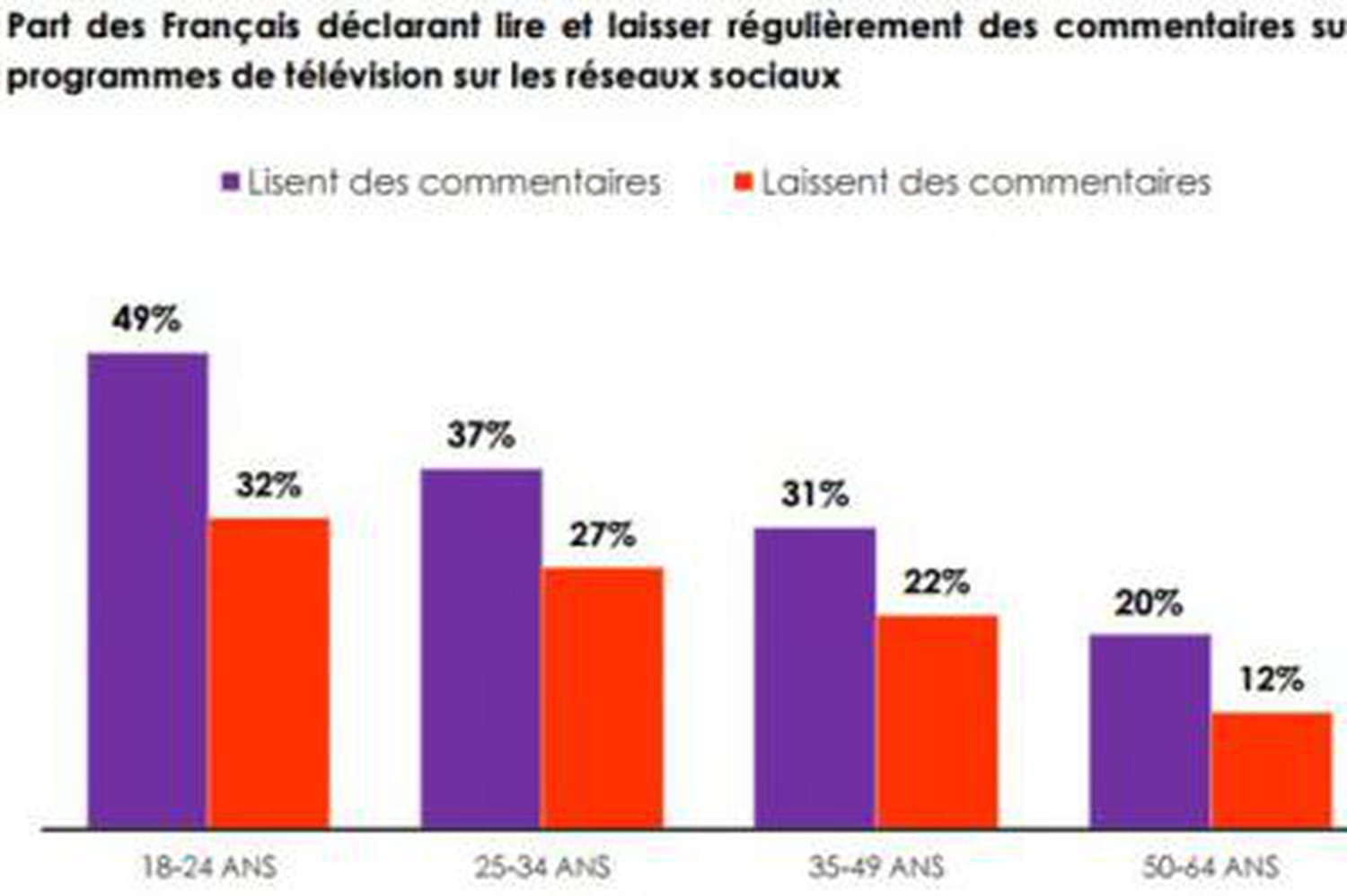 49% des 18-24 ans lisent régulièrement des commentaires sur la télévision sur les réseaux sociaux (indice 163 vs ensemble de la population) et 32% y laissent régulièrement des commentaires (indice 152). Des pratiques qui ont tendance à diminuer avec l'âge.