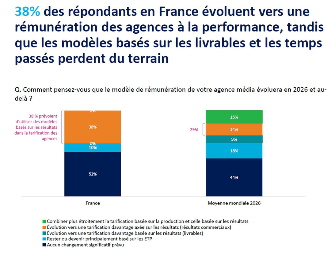 Une prudence qui se fait sentir aussi dans la relation avec les agences : 38% des répondants en France (contre 29% au niveau mondial) évoluent vers une rémunération des agences basée sur les résultats, tandis que les modèles basés sur les livrables et les temps passés perdent du terrain. "La rémunération à la performance établit une corrélation directe entre la performance des agences et les résultats commerciaux. Cette tendance illustre une volonté de responsabilisation et d'efficience accrues face à des budgets restreints", résume Nicola Chatterton-Sievers, directrice générale France d’Ebiquity.