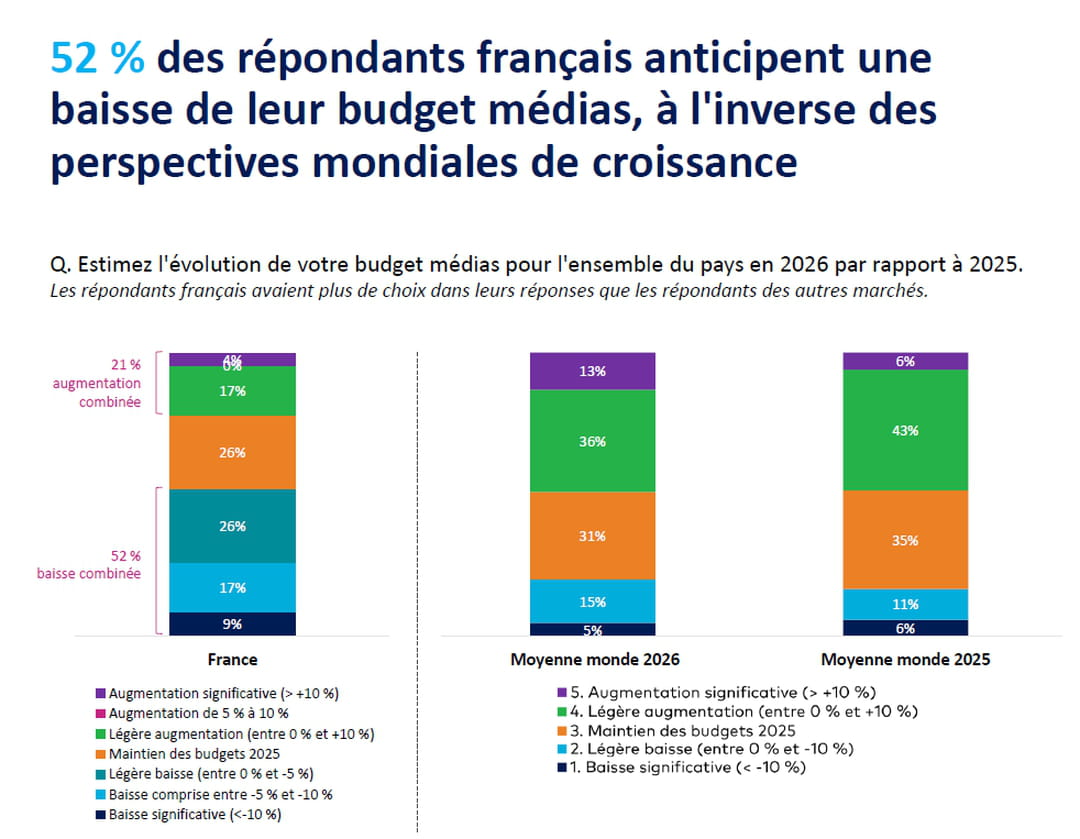 Une nouvelle étude, et pas des moindres, vient confirmer les difficultés que le marché publicitaire français devra affronter en 2026 : à contre-courant des tendances mondiales, 52% des annonceurs français interrogés dans le cadre d’une enquête internationale déclarent leur intention de baisser leur budget publicitaire en 2026. Ce résultat contraste avec l’optimisme international : dans le monde, seuls 20% des annonceurs entendent baisser leurs budgets en 2026 et 49% déclarent leur intention de les augmenter.