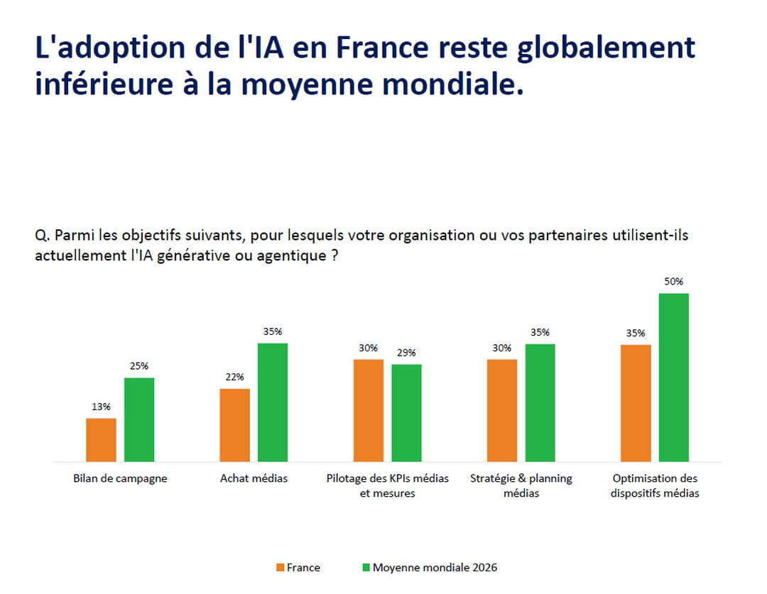 A noter une adoption de l’intelligence artificielle sensiblement inférieure en France que mondialement dans la plupart des domaines du marketing avec de plus l’expression d’inquiétudes de la part des annonceurs consultés vis-à-vis de la transparence de leurs agences prestataires sur ce sujet.