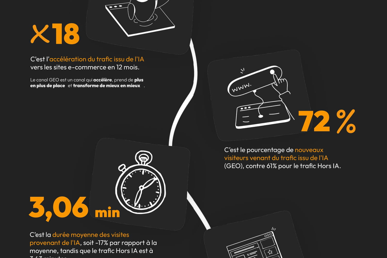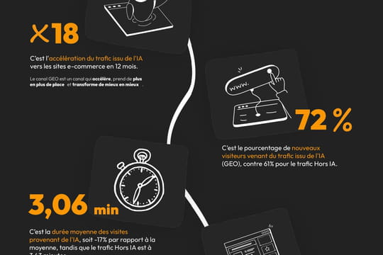 En l’espace d’une année, entre décembre 2024 et 2025, la part des IA dans le trafic envoyé vers les sites e-commerce de 13 enseignes de l’Association familiale Mulliez (dont Auchan, Decathlon ou Leroy Merlin) a été multipliée par 18. Un trafic qui, comparé aux sources classiques, est fait davantage de nouveaux visiteurs, qui passent en moyenne moins de temps (-17%) à consulter des pages (-25% de pages vues par session) mais qui va direct au but : 90% de sessions via LLM arrivent directement sur une page de “fiche produit” (contre 60% pour les autres sources). Résultat : un taux de conversion, de 1,7%, déjà très proche du taux de conversion moyen classique des sites, autour de 2%. Ce sont quelques-uns des principaux constats que Valiuz dévoile en exclusivité au Journal du Net ce 4 février dans le cadre de la toute première édition de son "Baromètre GEO", désormais semestriel, que vous pouvez consulter ci-après.