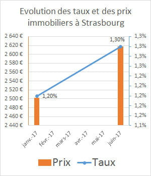 Les prix immobiliers moyens à Strasbourg s'élèvent à 2 618 euros en juin 2017. Un chiffre supérieur de 4,6% à celui enregistré au début de l'année. Ajoutez à cela des taux immobiliers en hausse de 0,1 point sur la période et vous obtiendrez un surcoût de 13,5% pour l'acquéreur strasbourgeois sur le montant du crédit, soit 4 664 euros de plus pour l'achat d'un logement de 110 mètres carrés.