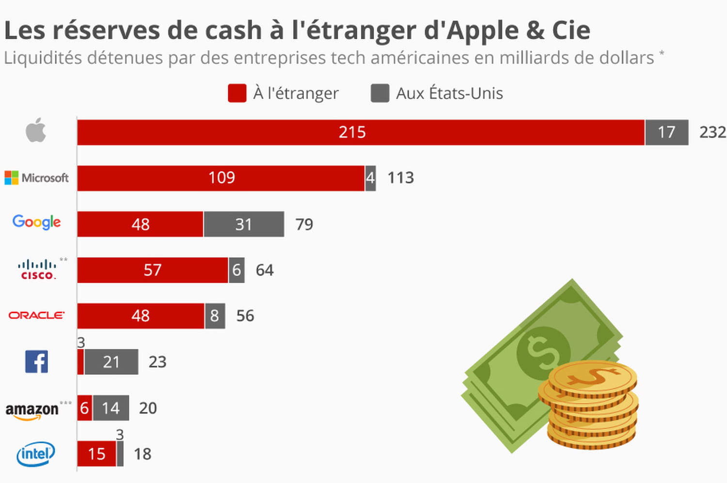 Même du côté de Microsoft, il y a de quoi en tomber dans les pommes. Apple dispose de près de deux fois plus de liquidités hors des frontières des Etats-Unis que la firme de Redmond, soit 215 milliards de dollars. Microsoft détient de son côté 109 milliards de dollars, deux fois plus encore que les autres géants américains de la tech Google (48 milliards), Cisco (57 milliards) et Oracle (48 milliards).