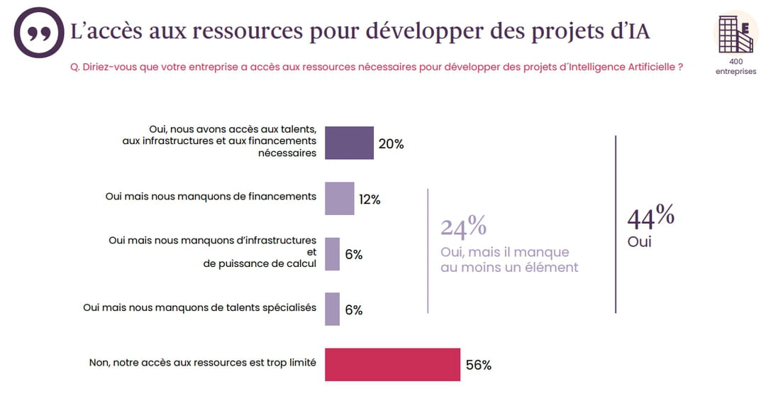 Quels sont les principaux freins à l'adoption généralisée de l'IA ? En premier lieu, c'est bien la question des moyens, talents spécialisés, infrastructures et financements, qui revient en majorité. Plus de la moitié des dirigeants (56%) estiment que leur accès aux ressources nécessaires pour développer des projets d'IA reste "trop limité". Seules 20% des entreprises déclarent disposer à la fois de talents spécialisés, d'infrastructures et de financements pour construire leur stratégie IA. Mais la fracture est particulièrement marquée en fonction de la taille des organisations. Là où 66% des PME de 50 à 99 salariés se disent démunies, les grandes entreprises de plus de 250 collaborateurs ne sont "que" 49% dans cette situation.