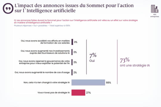Quel héritage pour le Sommet pour l'action sur l'IA ? Dans un sondage OpinionWay pour Elastic, 400 dirigeants ou DSI d'entreprises représentatives du secteur privé de plus de 50 salariés ont été interrogés pour le savoir. Et le constat est lourd. Malgré une bonne notoriété de l'événement, l'impact concret sur les organisations reste marginal. Seuls 7% des entreprises déclarent avoir modifié leur stratégie d'intelligence artificielle suite aux annonces gouvernementales. Pour les deux tiers restants (66%), le Sommet n'a strictement rien changé à leur approche de l'IA. Plus préoccupant encore : plus d'un quart des entreprises françaises (27%) reconnaissent ne pas avoir de stratégie IA du tout, révélant un retard structurel.