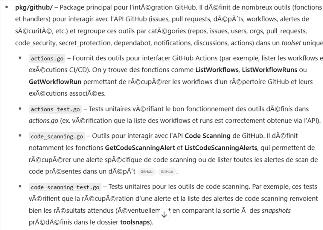 On voit dans l'extrait une réponse détaillée, structurée et précise. Attention à vérifier les réponses données. Des liens permettent d'aller directement sur GitHub à la page demandée. Il est aussi aisé de demander à ChatGPT de corriger, ou d'ajouter un élément. Les non développeurs peuvent par exemple demander une aide pour comprendre ces documents.