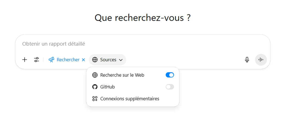 Le fonctionnement des connecteurs est en théorie assez simple. Rendez-vous dans l'interface de ChatGPT. Cliquez sur Outils, et "recherche approfondie". En effet, pour utiliser les connecteurs, vous devez passer par Deep Research. Cet agent, qui se sert du modèle o3, est capable de mener des recherches complexes de manière autonome. Entrainé pas renforcement sur des tâches de navigation et de raisonnement, il parcoure les sites web et interprète le contenu, les tableaux de PDF et d'images. Il peut traiter des centaines de sources différentes. Depuis le 25 février 2025, il est disponible pour les abonnés ChatGPT Plus, Team, Edu et Enterprise. Ensuite, allez dans "sources" et sur le connecteur concerné. Vous pouvez alors poser votre question dans l'outil.