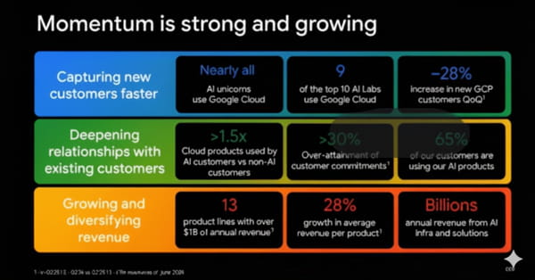 Thomas Kurian met en avant une dynamique forte : 9 des 10 plus grands laboratoires d'IA mondiaux utilisent Google Cloud, 65% des clients Google Cloud déploient déjà des solutions d'IA, et ces derniers adoptent en moyenne 1,5 fois plus de produits que les autres.