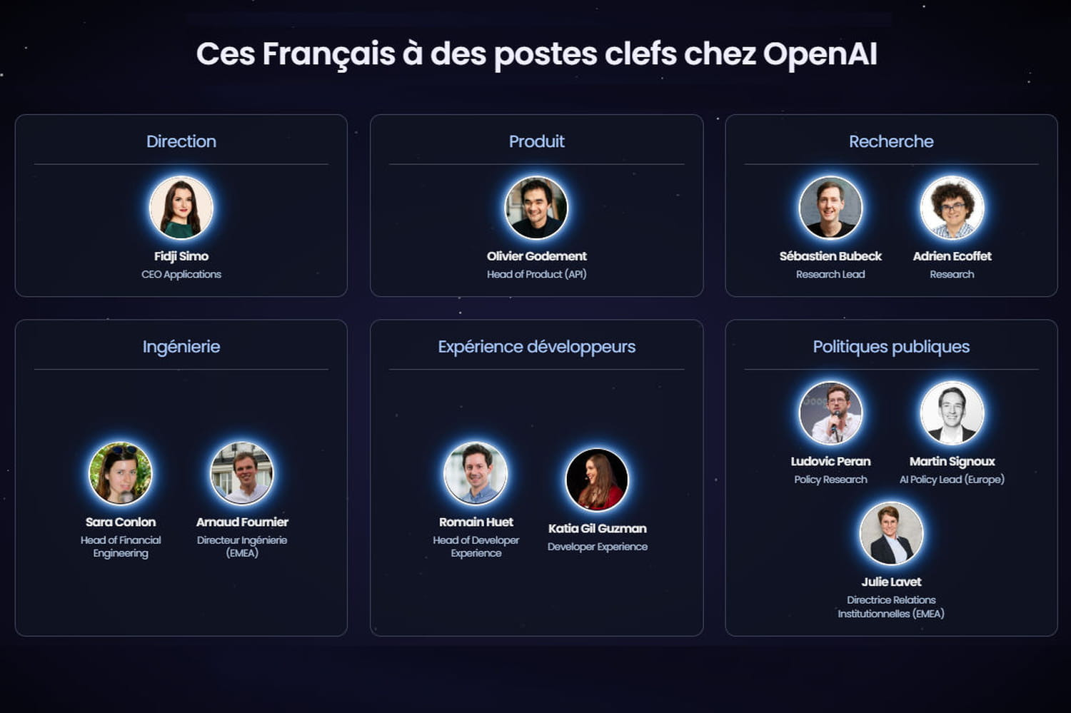 La présence française s'étend jusqu'aux politiques publiques, où trois Français structurent la stratégie européenne d'OpenAI : Martin Signoux (AI policy lead Europe), Julie Lavet (directrice EMEA des relations institutionnelles) et Ludovic Peran (policy research). Enfin, plus parlant encore, le français Arnaud Fournier, basé à Paris, est responsable d'une équipe dédiée aux développement de produits OpenAI en lien avec les partenaires de l'entreprise (Forward Deployed Engineers). Une escouade d'ingénieurs composée en majorité de profils issus du bureau parisien d'OpenAI.