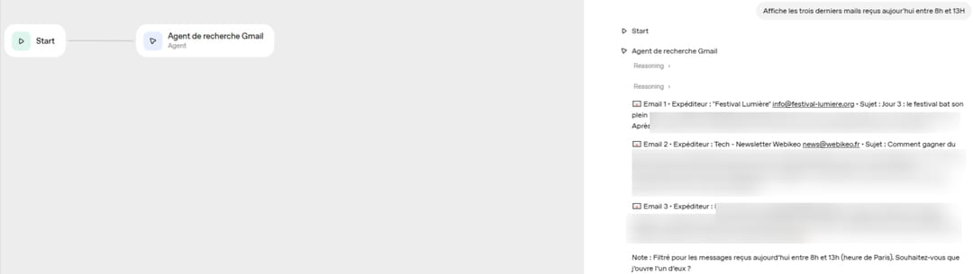 Au niveau de la prise en main, d'après nos tests, AgentBuilder permet de créer des workflows parfois plus simples que ceux de n8n. Pas besoin de nœud Transform pour préparer les données, de nœud Code pour filtrer ou de nœud OpenAI séparé. Grâce au "Function Calling", tout est fait par un seul Agent intelligent. Celui-ci sait quand et comment utiliser l'outil Gmail. Il génère automatiquement les paramètres et formate automatiquement les résultats