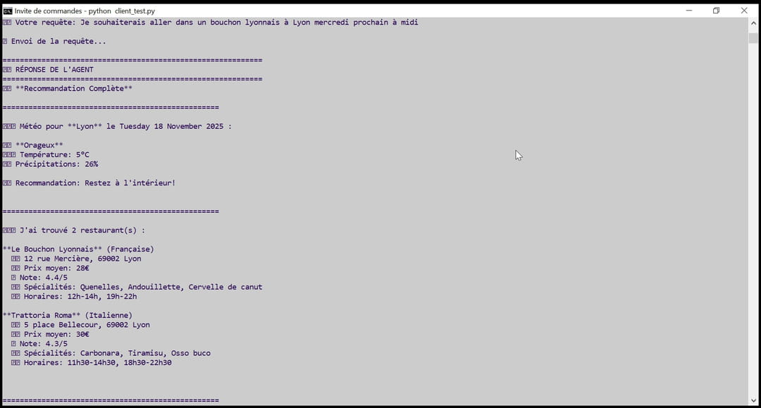 Indiquons qu’afin de vérifier que les agents fonctionnent, il est possible de mentionner dans le navigateur : http://localhost:10000/.well-known/agent.json pour le Restaurant, http://localhost:10001/.well-known/agent.json pour la Météo et http://localhost:10002/.well-known/agent.json pour le Coordinateur.