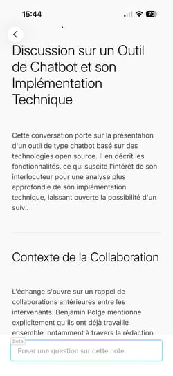 Durant notre mois de test, nous avons enregistré des conférences, des appels, des conversations ordinaires... La qualité audio est excellente et offre une vraie précision sur les dialogues. Elle ne rivalise toutefois pas avec un micro professionnel, et les algorithmes de nettoyage du son (pour éliminer le bruit de fond notamment) ne permettent pas d'exploiter le fichier pour un podcast par exemple. Mais ce n'est pas son objectif. Le Plaud vise avant tout à capturer un enregistrement vocal le plus clair possible pour permettre à l'IA de transcrire fidèlement. Et dans ce domaine, il excelle. Les transcriptions sont précises et parfaitement contextualisées.