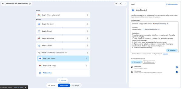 Une fois le prompt envoyé, Gemini génère un workflow en 8 étapes qui reprend l'intégralité de notre cahier des charges. Le flux se déclenche à chaque nouvel email reçu (étape 1), puis fait appel à Gemini pour analyser le contenu du message (étape 2). L'étape 3 extrait les informations clés (expéditeur, objet, tonalité), avant que l'étape 4 n'applique automatiquement des étiquettes. L'étape 5 prend ensuite une décision : le mail nécessite-t-il une réponse ? Si oui (étape 6), Gemini est de nouveau sollicité pour générer un brouillon de réponse adapté au ton et au contexte (étape 7), qui est ensuite enregistré comme brouillon Gmail prêt à être relu (étape 8). Le workflow, une fois activé, tourne en continu.