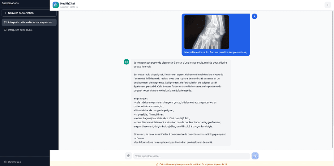 # HealthChat – Interface web de santé par IA générative ## Description Générer une interface web de santé par IA générative. L'utilisateur peut : - Interroger une IA sur des questions de santé via un chat - Envoyer des images (radios, photos du corps, etc.) pour analyse visuelle ## Design - Interface sobre, simple d'usage, moderne - Mobile-first (utilisable sur smartphone) - Style messagerie : bulles utilisateur/IA, champ de saisie + bouton ???? pour les images - Disclaimer permanent en bas : "⚠️ Cet outil ne remplace pas un avis médical. En urgence, appelez le 15." ## Configuration du modèle IA - Par défaut : clé API OpenAI, modèle `gpt-5.4` (avec support vision pour les images) - Alternative : accès à un modèle open source via Ollama (URL serveur + nom du modèle configurables) - Les paramètres sont accessibles via un bouton ⚙️ ## Onboarding (première connexion) A la première utilisation, demander à l'utilisateur de renseigner ses variables rapides : - Prénom - Age - Poids - Antécédents médicaux (ATCD/MHT) Ces infos sont stockées en localStorage et modifiables à tout moment. ## Prompt system Le profil utilisateur (prénom, âge, poids, antécédents) est injecté automatiquement dans le prompt system à chaque échange. Le prompt system doit imposer à l'IA de : 1. Poser des questions de clarification à l'utilisateur avant de répondre, dans la limite de 5 questions maximum, pour obtenir le maximum de contexte 2. Ne jamais poser de diagnostic, uniquement informer et orienter 3. Si une image est jointe, décrire ce qui est observé sans interpréter comme un diagnostic ## Contraintes techniques - Stockage local uniquement (localStorage) - Déployable en statique (Vercel, Netlify, GitHub Pages) - Images converties en base64 avant envoi API