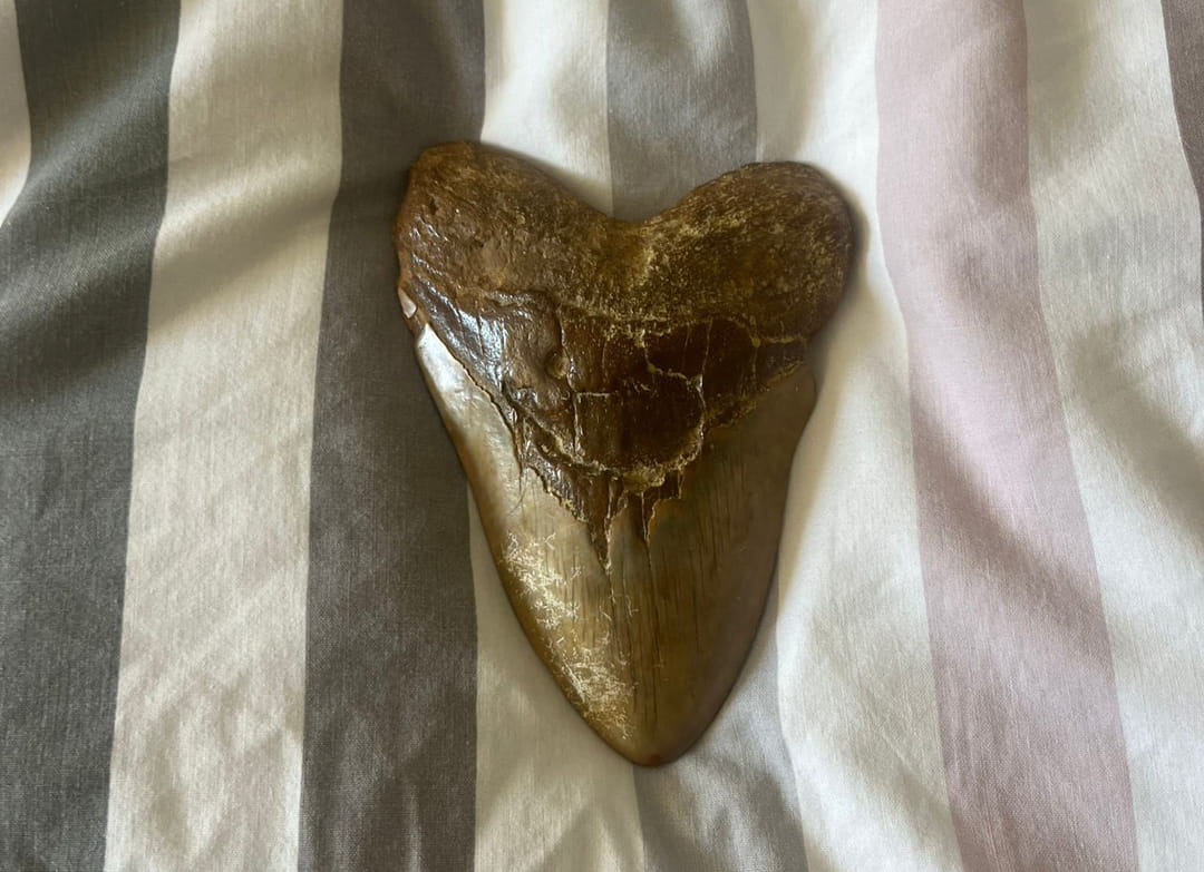 C’est une dent, sa taille est belle, elle épouse parfaitement la paume de sa main. La racine, noircie par le temps, pourrait être confondue avec un vulgaire caillou. Mais c’est la couronne - partie claire et visible de la dent - qui ne fait aucun doute sur l’origine de son propriétaire : c’est une dent de requin. Les côtes normandes sont à 120 km, il ne peut s’agir des restes d’un animal marin de notre temps.