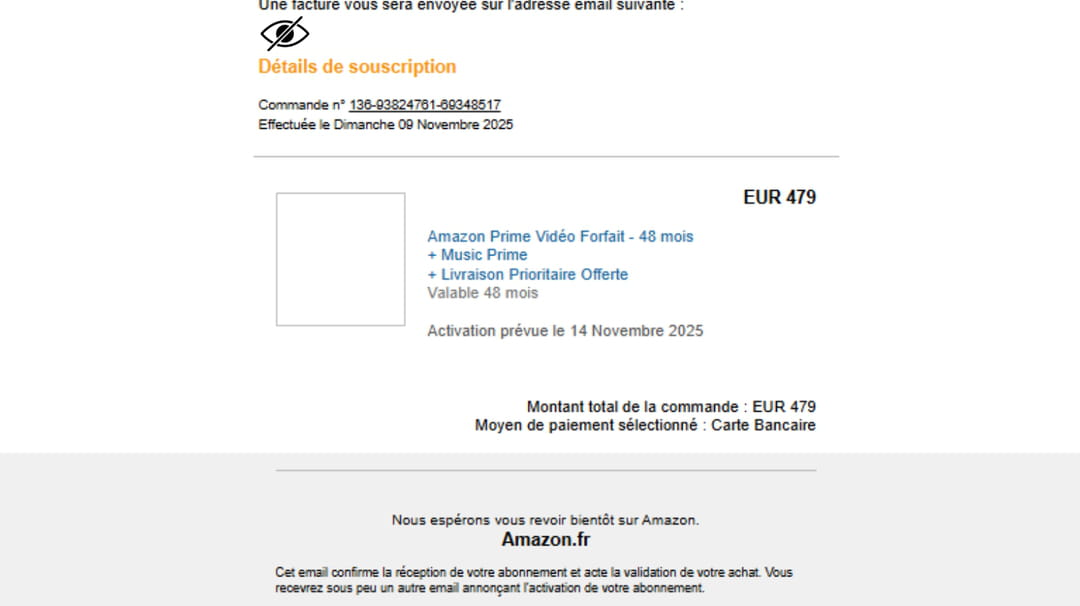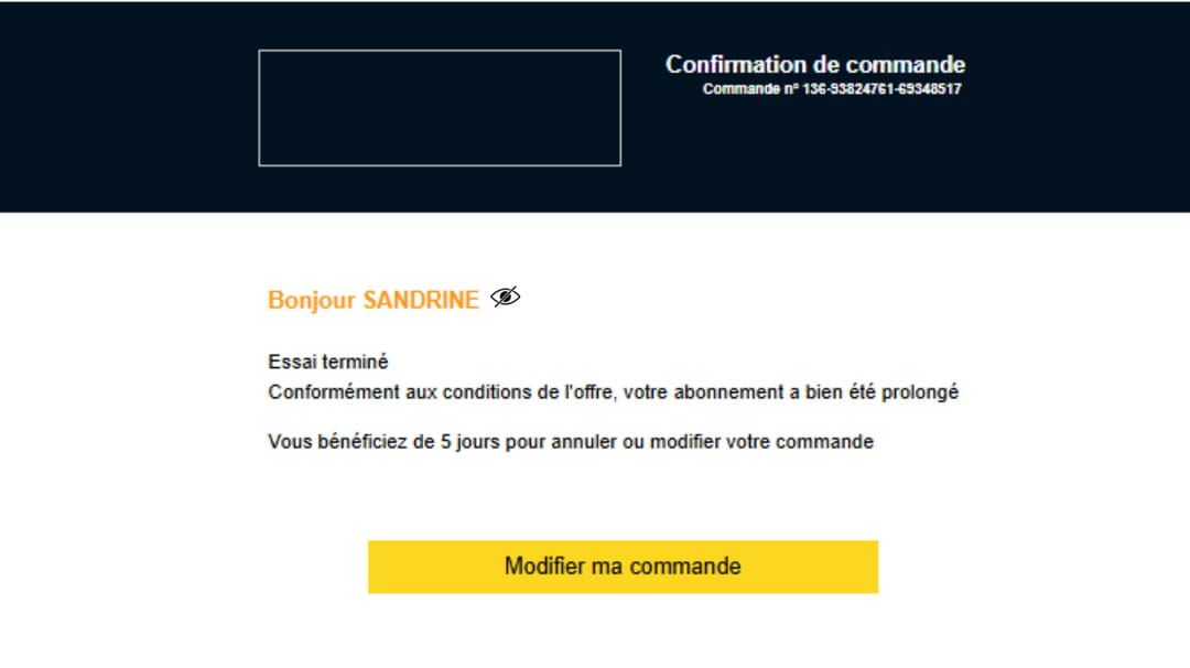 Avec l'aide de son entourage, Sandrine épluche chaque détail du mail qui lui indique : " Bonjour Sandrine, Essai terminé. Conformément aux conditions de l'offre, votre abonnement a bien été prolongé. Vous bénéficiez de 5 jours pour annuler ou modifier votre commande." La commande en question ? Un abonnement Prime Video 48 mois avec Music Prime et les avantages de livraisons Amazon pour la modique somme de… 479 euros. Voici une capture d'écran du mail où nous avons anonymisée les informations personnelles :
