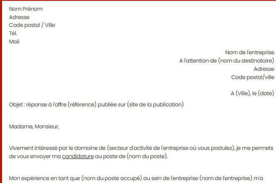 Voici un modèle de lettre de motivation adaptable à la majorité des offres d'emploi. Il est téléchargeable et modifiable dans n'importe quel traitement de texte comme Word ou Google Docs. Le contenu peut aussi être copié-collé directement dans le corps d'un email.