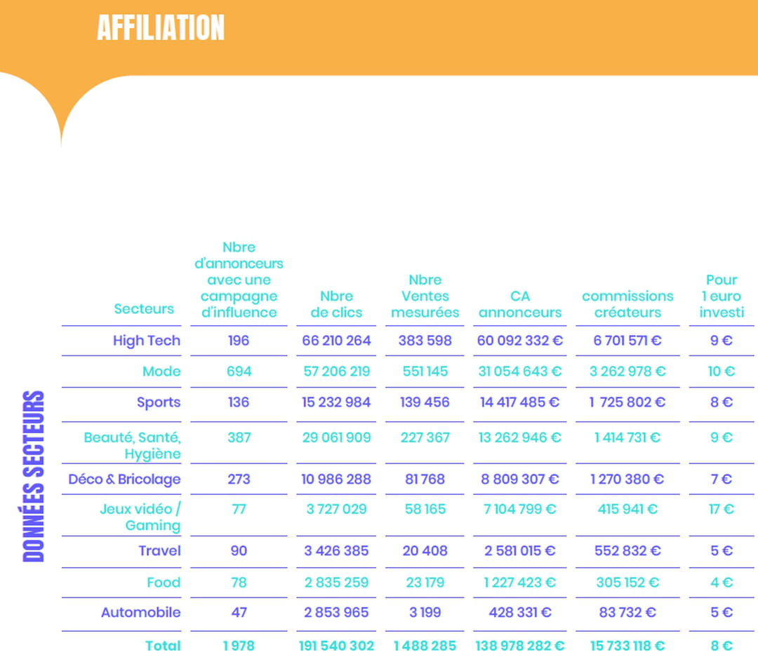 Le document passe également au crible l’influence selon le modèle de l’affiliation sur neuf secteurs d’activité avec une grosse palette indicateurs comme le coût par clic, le pourcentage de la commission moyenne des créateurs, le taux de transformation, le panier moyen, la répartition par réseau et par taille d’influenceur, etc. Le gaming, la mode et la high-tech sont les secteurs qui génèrent les ROI les plus élevés.