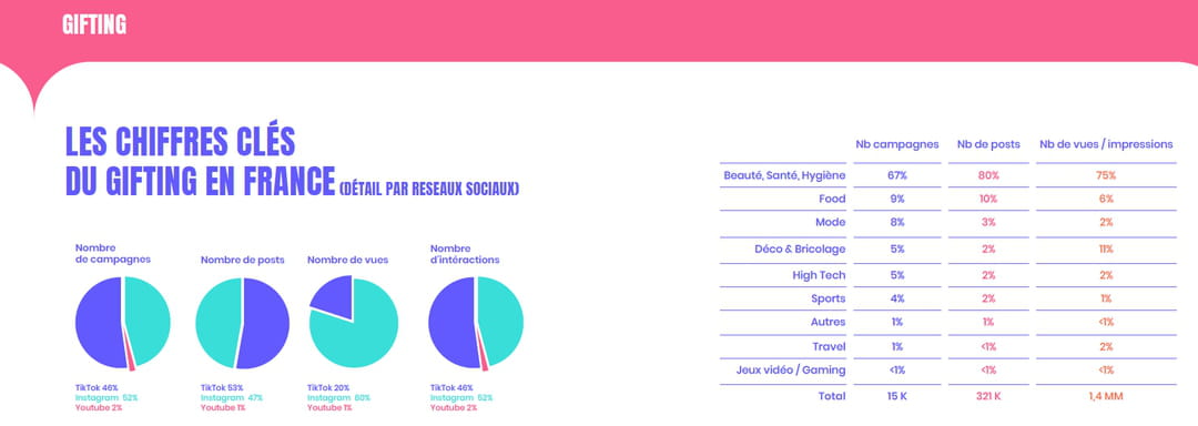 Instagram et TikTok dominent largement les campagnes de gifting, Youtube étant presque insignifiant. TikTok représente légèrement moins de campagnes mais comptabilise plus de posts et surtout beaucoup plus de vues qu’Instagram, selon les auteurs de l’étude. Sur la dizaine de secteurs analysés, la beauté, avec 67% des campagnes, domine très largement les campagnes de gifting. Sur ce secteur, le gifting représente à lui seul 80% des contenus d’influence générés, selon les auteurs. Logique… vu que ce levier apparaît comme la garantie pour les marques "d’obtenir une visibilité massive à moindre coût".