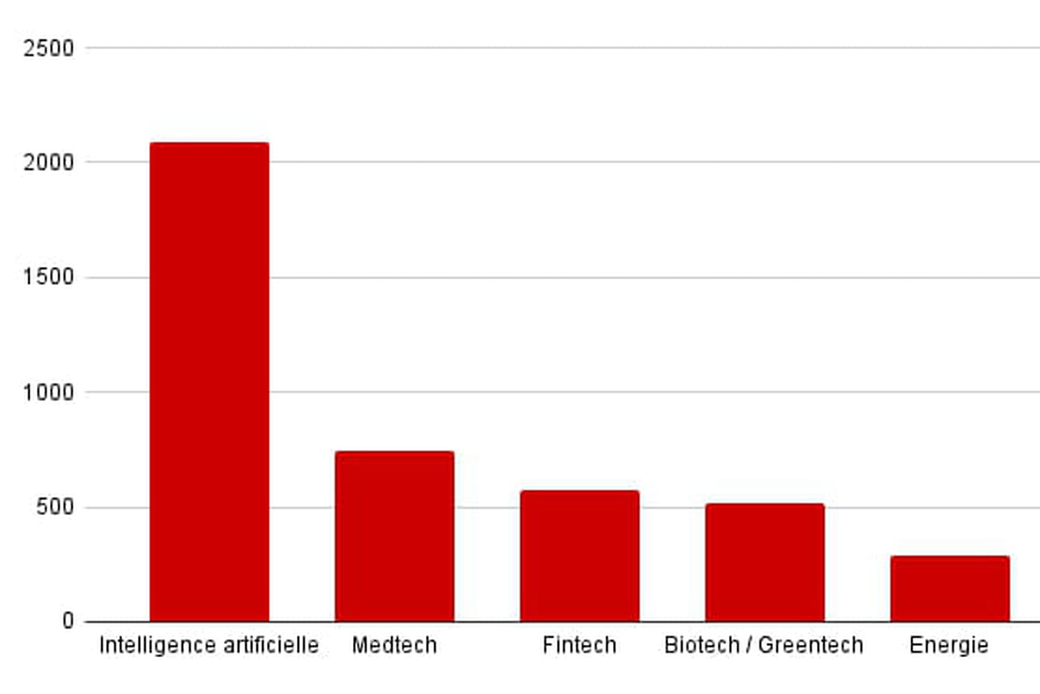 Sur 17 secteurs, seuls 4 ont levé plus de fonds qu'en 2024. Il s'agit de l'intelligence artificielle (+80%), la medtech (+78%), l'e-RH (+34%) et la foodtech (+81%). Tous les autres ont récolté moins d'argent qu'en 2024, à commencer par l'IoT (-98%), les mobilités (-77%) et la proptech (-74%).